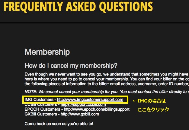 「How do I cancel my membership?(退会の仕方)」と表記がある下に、決済代行会社の一覧があります。