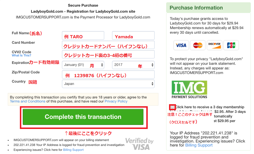 Ladyboygold(レディボーイゴールド)では”Ladyboy Pussy”などの他のサービスを3日間お試しで販売するクロスセルがありますので、不要な場合はこのチェックを外してください。